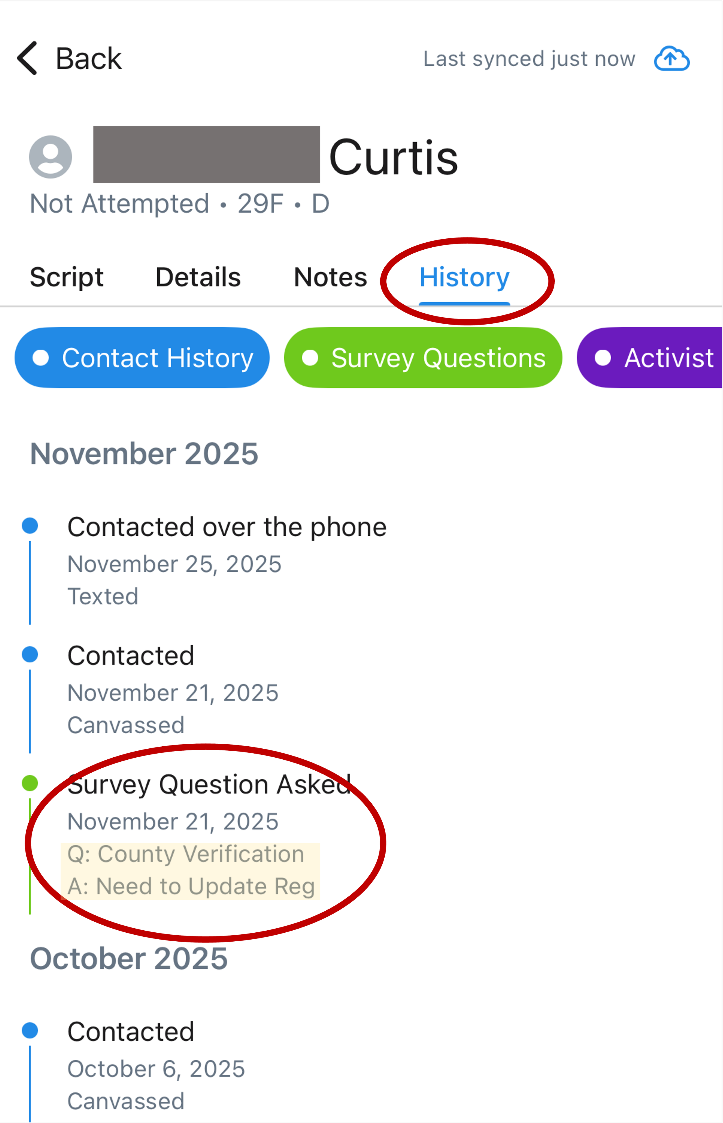 Click on the voter's name, then click the History tab. If you see an option that says "Survey Question Asked, Q: County Verification", this will show the reason why their signature was rejected.